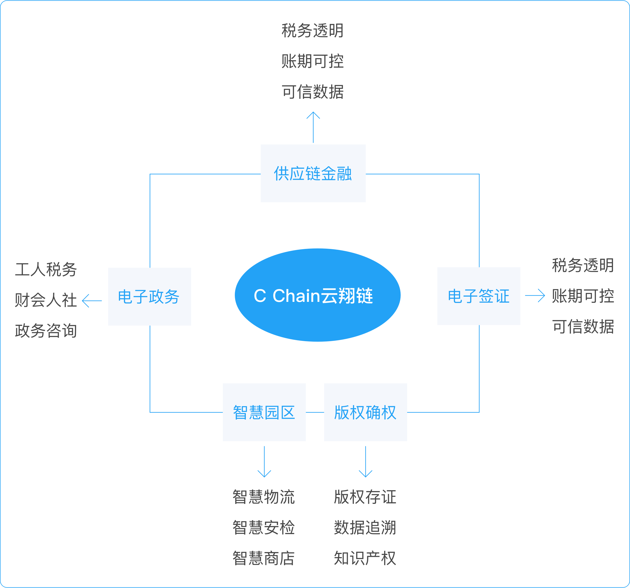 C chain 云翔链是由上海市嘉定区南翔镇人民政府、上海蓝天经济城指导,由创飞科技基于区块链底层技术自主开发的电子政务服务链。